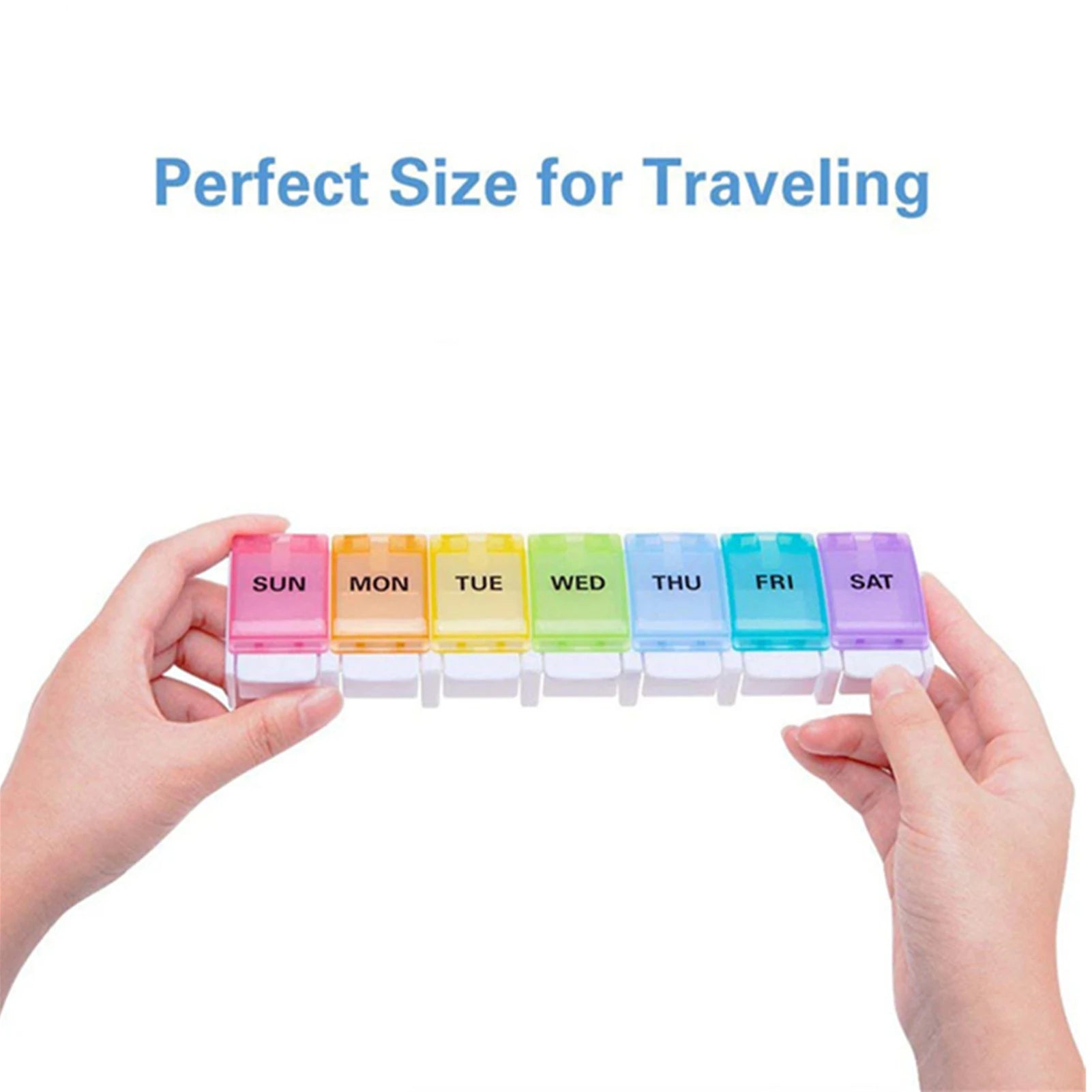 This colorful 7-day weekly pill organizer makes medication management simple and fun. Each day has its own labeled compartment in a different rainbow color for easy identification. The compact, slim design is perfect for travel - fits easily in purses, bags, or luggage. Individual compartments snap securely closed to prevent spills. Clear labeling (Mon-Sun) ensures you never miss a dose. Made from durable, BPA-free plastic. Perfect for daily vitamins, supplements, or medications at home or on the go.