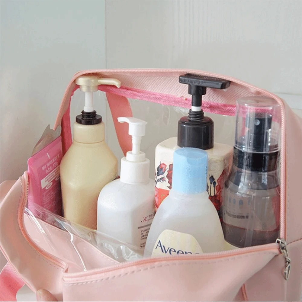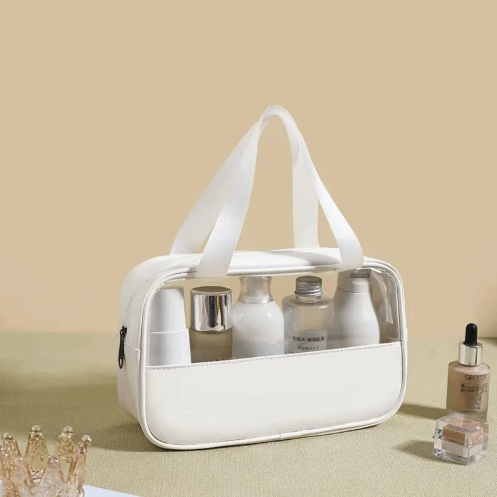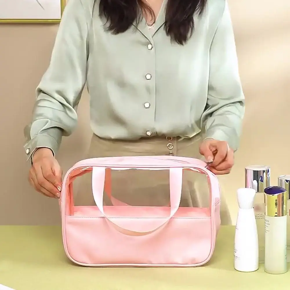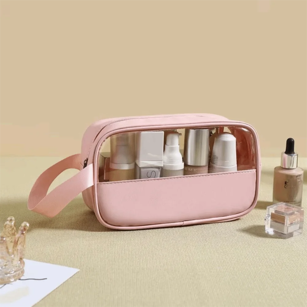 This transparent travel cosmetic bag combines functionality with style. The clear design lets you see all your beauty essentials at a glance, making airport security checks and morning routines effortless. Made from waterproof material, it protects your skincare products and makeup from spills and moisture. The spacious interior holds full-size bottles, brushes, and cosmetics, while the sturdy handle makes it easy to carry. Perfect for travel, gym, or daily organization.